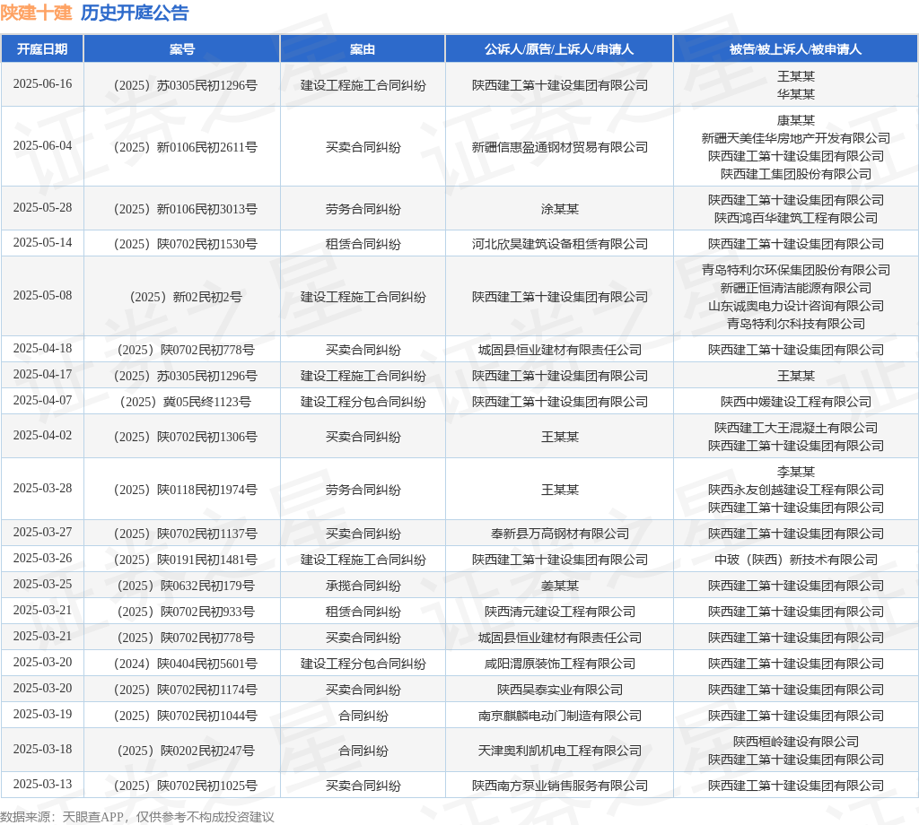 案号:(2025)陕0702民初1530号审理法院:汉中市汉台区人民法院案由:租赁合同纠纷当事人信息: 原告/上诉人:河北欣昊建筑设备租赁有限公司 被告/被上诉人:陕西建工第十建设集团有限公司开庭日期:2025年5月14日根据统计,近一年内以陕西建工第十建设集团有限公司为当事人的历史开庭公告有71则,其中案由为“买卖合同纠纷”的公告以20则居首,其次为“建设工程施工合同纠纷”有13则,“建设工程分包合同纠纷”有8则。历史开庭公告(前20条)如下: