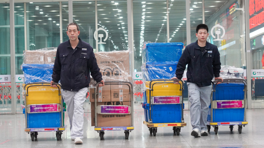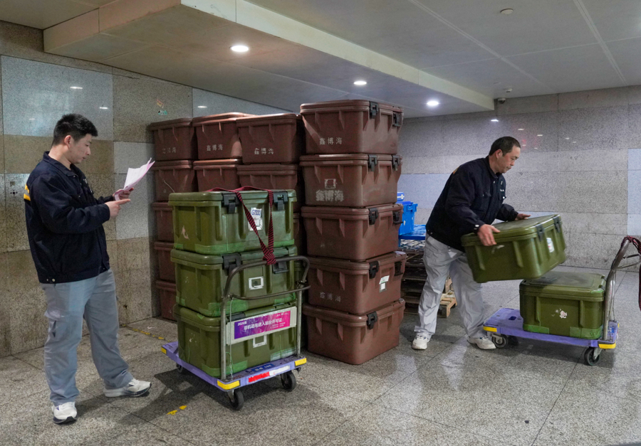 两人每天上午要完成11趟列车配送,每趟配送最少耗时25分钟,遇到16节编组车或重联车,耗时更久。他们用平板小推车运送周转箱,常常左右手各拉一辆平板推车,在仓库与站台之间来回穿梭。“仓库到最远的站台至少要走15分钟,赶车时不敢有半点耽搁。”马壮壮坦言,春运期间每个车次的商品量较往常增加近一倍,每趟车需运送近50个周转箱,任务繁重却容不得丝毫马虎。